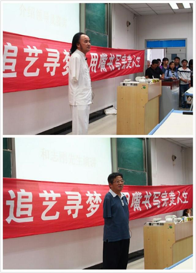 两位讲座嘉宾均是无臂残疾人,但是他们身残志坚。陈伟强先生,曾被评为全国省市优秀文艺创作奖、十佳青年、十大杰出人物,中国百位优秀残疾名人。他从一个无臂少年成长为一个无臂青年书画家,靠的是顽强的意志和不懈的努力。和志刚先生是著名口书书法家,曾获得第十四届“中国十大杰出青年”、“全国五一劳动奖章”,其书法笔力雄健,用笔浑厚自然,布局法度严谨,书法作品曾获“世界残疾人书画展”金奖。