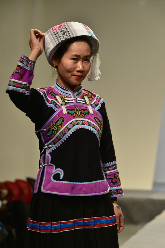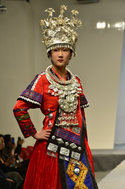 参加此次研修班的学员们通过一个月左右的理论学习和创意实践,不仅开阔了眼界,提高了自身的艺术素养和审美能力,更加提升了技艺创新的能力。在动态秀的创意展演中,学员们在T台上亲自演绎了独具特色的民族服饰,淳朴与热情的背后可以感受到传统文化的魅力和感染力。展示的服装色彩以传统红、蓝、黑色为主打,配以局部的黄和粉色点缀,短卦搭配百褶裙等多种服饰,绣有各式各样的民族图案纹样,且技法各异,很多都需花费几个月甚至几年时间精心制作而成。除了精致特色的民族服装,各式各样的头饰和配件也充分地展现出独有的民族韵味,绚丽多彩的服饰造型和内涵丰富的服饰图案也传递着民族文化和服饰艺术。