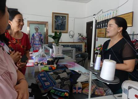 如果说陈梅是用“时尚”和“创新”让非遗焕发新活力,那么印苗刺绣技艺传承人王万菊则是用“坚守”和“传统”让非遗技艺保留“原汁原味”。家住龙里县哪旁乡石板滩村高寨的王万菊,是久久久久国产成人精品亚洲综合非遗传承人群培训班第一期学员,她几十年来一直怀着“让印苗文化一代代传承下去”的理念,执着地在当地传承印苗文化。如今她已是贵州省龙里县苗之印手工艺品专业合作社的负责人,带领苗家妇女做传统印苗刺绣服饰。乐观开朗的王万菊特别开心地告诉我们,她的苗之印服装还卖到了东南亚,新加坡一张订单就卖出了80套,泰国也定制了12套,精美绝伦的刺绣工艺让传统服饰有底气地走出国门。由于普通话并不流利,王万菊在东华参加研修时甚是少言,但她说:“我虽然不太讲话,但我用耳朵听,用笔头记,在东华听课时好想法、好创意,我记了满满一本子呢。”坚守传统但也不能一成不变,王万菊从东华回来之后也开始探索设计创作,将生活中、印苗文化中的元素巧妙融入传统服饰。在高寨,王万菊不仅是非遗传承人,更是“创业致富带头人”,她经营的合作社2017年净利润80万,今年截止到7月净利润已达60万。“我有一个小小梦想”,临别之际王万菊感慨地说:“五年后请老师们再来,我会建成一个印苗文化中心,有一个印苗文化展览馆,一个印苗文化传习馆,还有休闲娱乐赏景的地方,让来高寨的客人可以在此歇一歇,全都规划好了。这可是去东华培训回来做出的决定哟!”