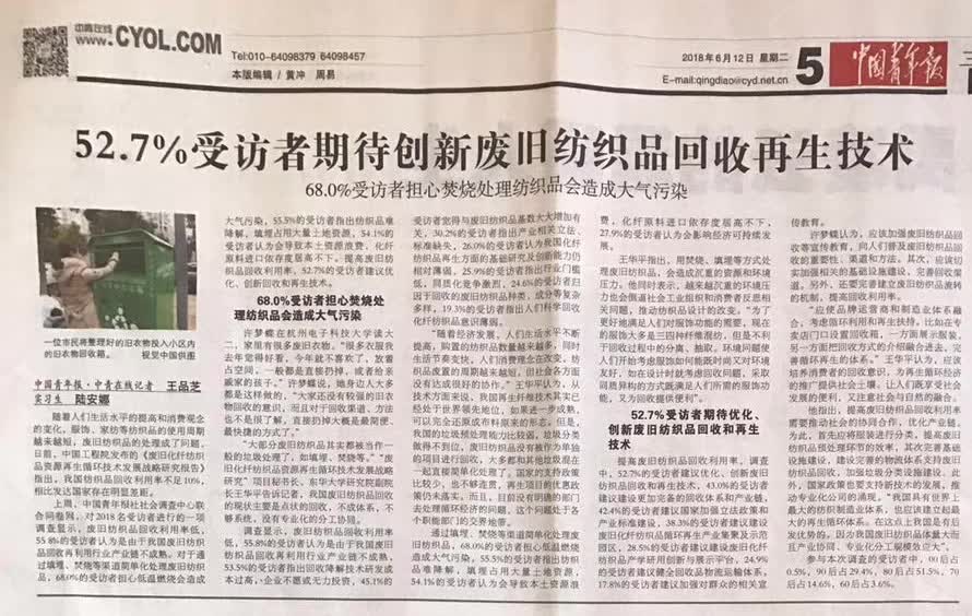 [中国青年报]52.7%受访者期待创新废旧纺织品回收再生技术 ——68.0%受访者担心焚烧处理纺织品会造成大气污染