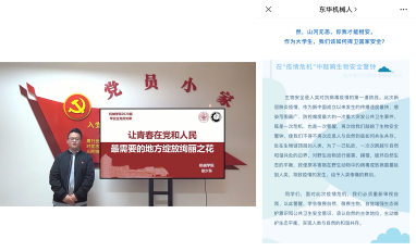 学院倡导新时代劳动教育与志愿服务、服务基层相结合,以弘扬新时代雷锋精神为主旋律,宣传东华志愿者、机械志愿者在疫情防控期间从我做起、同心聚力、共克时艰的故事,引领学生“学回信精神,担复兴大任”。