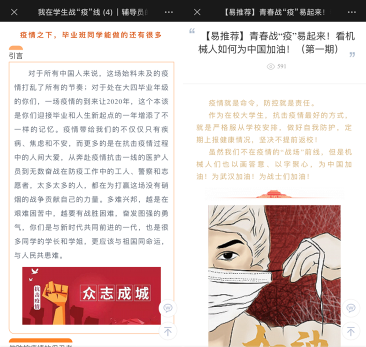 学院密切关注学生的思想和心理状态,加强疫情期间学生的网络思政教育和爱国主义教育。以易班网络思政平台为主阵地,面向师生等不同群体开设“我在学生战‘疫’线”“战‘疫’堡垒”“青春战‘疫’易起来”等专栏,通过辅导员的抗“疫”日记、空中系列主题班会、抗“疫”文艺作品等形式,讲好疫情防控中的中国故事,利用这一场没有硝烟的“全员战争”,借助社会这个“大课堂”、人民群众这位“好老师”,上好一堂生动而难忘的爱国主义“思政大课”。