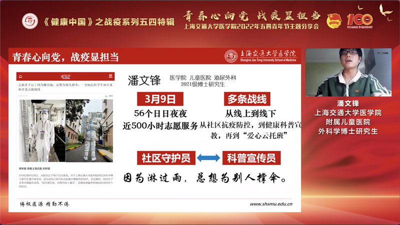 3月9日到4月30日,交大医学院附属儿童医院外科学博士研究生、“95后”潘文锋参与志愿服务已52天、将近500小时,经历了多条服务“战线”。担任社区守护员,从搬运防疫物资、发放餐食,到维持核酸检测秩序、扫码登记,再到走访楼栋发放抗原自测盒;作为社区宣传员,参与社区志愿者管理、制作每日抗疫小报和宣传小视频,至今已发布十五期;发挥专业特长,参与科普志愿服务,制作《抗疫指南合集》;参与“云帮扶授课”“爱心云托班”等线上陪伴服务,为居家或隔离的抗疫一线人员子女提供“一对一”辅导……