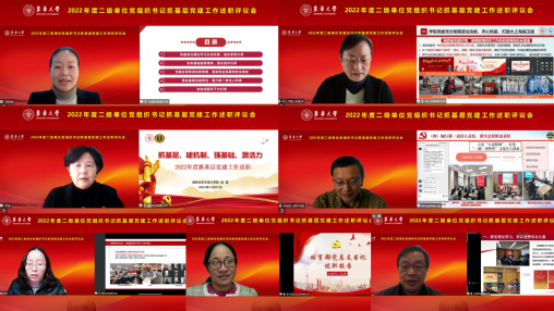 刘承功逐一点评并讲话,对全校各二级单位党组织认真履行管党治党主体责任,狠抓基层党建工作落实,抢抓机遇,攻坚克难,特别是各级党组织和广大党员在疫情“大考”中,践行初心使命,充分发挥作用,推动形成以高质量党建引领高质量发展的“奋进”新格局给予肯定。他指出,2023年是全面贯彻落实党的二十大精神的开局之年,是实施“十四五”规划的又一个关键之年,学校各级党组织要立足全面学习贯彻党的二十大精神,深化构建与学校高质量创新发展相适应的“大党建”工作格局。他强调,要突出政治引领,强化政治功能,持续全面学习贯彻党的二十大精神,落实“学思用”贯通机制,切实把学习成果转化为抓班子带队伍、统筹推进干部和人才队伍建设、推动中心工作、提高治理效能等方面的思路举措和进展成效;要融入中心大局,增强组织功能,以《中国共产党普通高等学校基层组织工作条例》为遵循,以本轮创建“上海党建工作特色高校”为载体,实施“铸魂·治学育人”“引领·党建创优”“融合·创新发展”三项“奋进计划”,全面推进二级单位党组织和基层党支部夯实基础、特色攻坚、辐射带动、发挥作用,以高质量党建引领各项事业高质量创新发展;要深化责任落实,提高政治能力,进一步筑牢“两个体系”,创新“五类示范”,想在前头、干在前沿、走在前列,比学赶超,对标争先,不断提升服务国家重大战略和区域经济社会发展的能力和水平,在新时代新征程奋力谱写“奋进东华”崭新篇章。